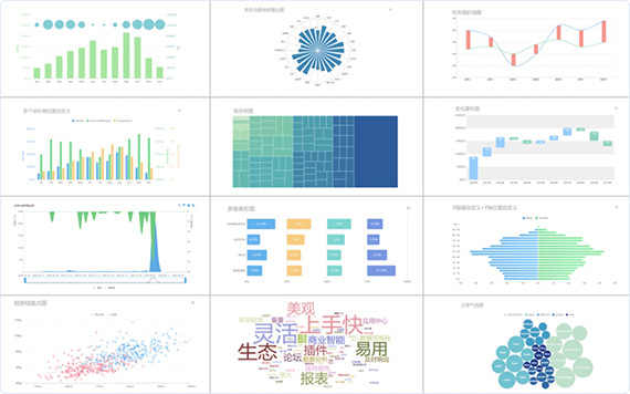 • 數(shù)十種的可視化圖表效果,包括柱形圖、折線圖、雷達(dá)圖、散點圖和詞云圖等,滿足不同人群的閱讀偏好,為您展示多樣數(shù)據(jù)信息提供全面支持