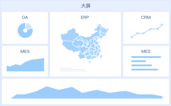 • 同一個大屏看板可以輕松整合ERP/OA/MES等多業(yè)務(wù)系統(tǒng)的數(shù)據(jù),打破信息孤島,進(jìn)行綜合展示分析,讓決策更清晰